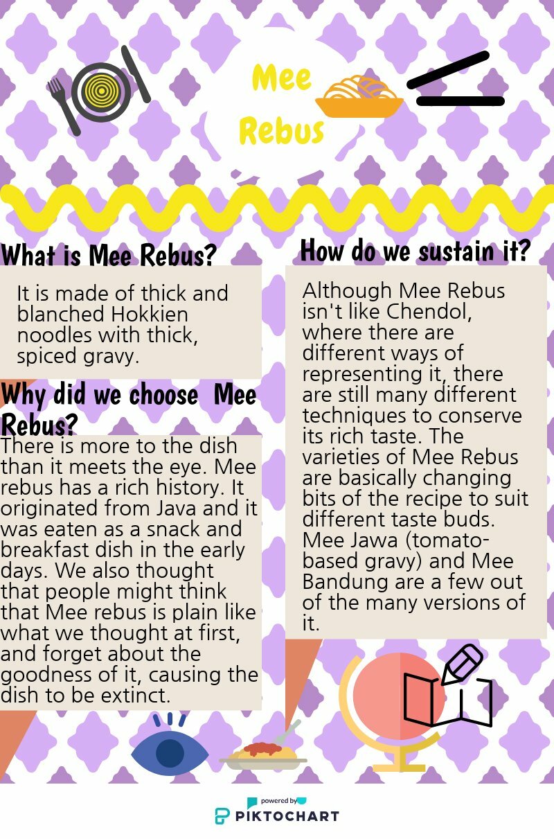 White space 28 May: We managed to finish the Chendol Food Model! We created the shape of a mountain of shaved ice and placed red beans and the green jelly by its side. We painted a bit of brown on to the shaved ice to represent gula melaka. There is a heart on top of the chendol food model to show how much we love the local food culture and we hope that such delicious food will not disappear. We made some parts of the Mee Rebus food model! We will be finishing it tomorrow!